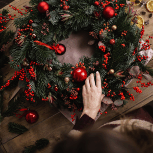 Welcome winter and the coming holidays with a festive wreath, made from fresh and fragrant evergreens, natural materials, and handmade bows.