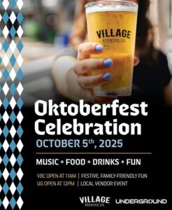 Join us Sunday, October 5th for Village Brewing Company’s all-day Oktoberfest celebration with food and drink specials! The Underground will be open 12-5pm with music and a local vendor market!